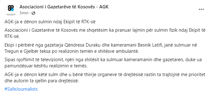 Në komunikatën që ka lëshuar Asociacioni i Gazetarëve të Kosovës (AGK) thuhet se këta të fundit e dënojnë sulmin e përdorur ndaj gazetares dhe kameramanit, teksa AGK-ja u ka bërë thirrje organeve të drejtësisë që këtë rast ta trajtojnë me prioritet, shkruan teve1.info