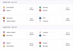 Ndeshjet e para janë Real Madrid – Bayern dhe Sporting – Arsenal në datën 7 prill në orën 21:00. Ndërsa në 8 prill në orën 21:00, do të zbresin në fushë Barcelona – AtleticoMadrid dhe PSG – Liverpool.