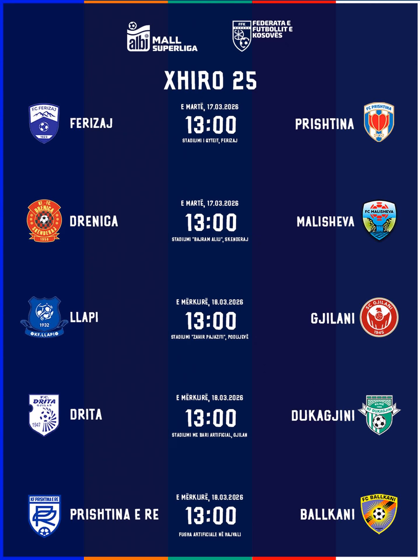 Ndërkohë, të mërkurën, gjithashtu prej orës 13:00, do të luhen përballjet: Llapi – Gjilani, Drita – Dukagjini dhe Prishtina e Re – Ballkani.