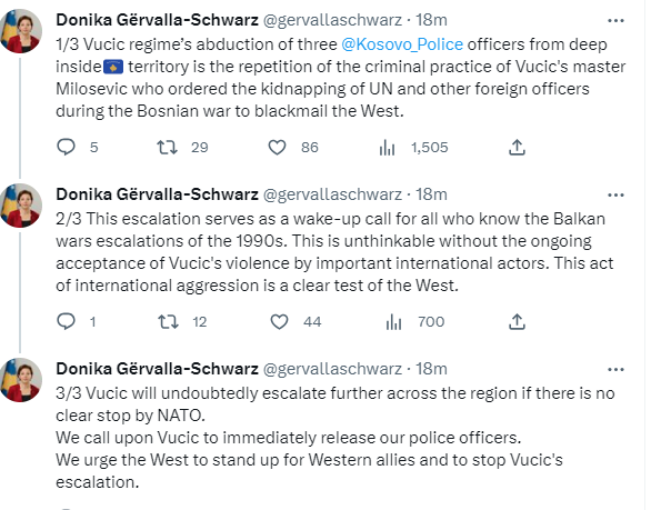 Ministrja e Jashtme e Kosovës, Donika Gërvalla ka thënë se kidnapimi i tre pjesëtarëve të Policisë së Kosovës, brenda territorit të vendit është përsëritje e praktikës kriminale Millosheviqit  “i cili urdhëroi kidnapimin e OKB-së dhe oficerëve të tjerë të huaj gjatë luftës në Bosnje për të shantazhuar Perëndimin”.