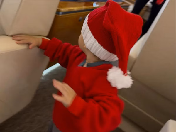 Fëmija mbante veshur një pulovër të kuqe të ndezur dhe pantallona sportive gri ndërsa bredhte rreth një avioni privat me ulëse lëkure.