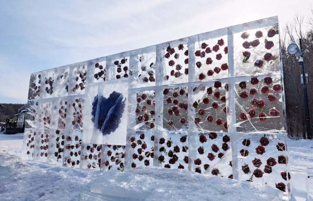 Në instalacion ndodhen trëndafila të kuq në blloqe akulli. Gjatë dimrit, akulli bëhet më transparent dhe i kristaltë me rënien e temperaturave.