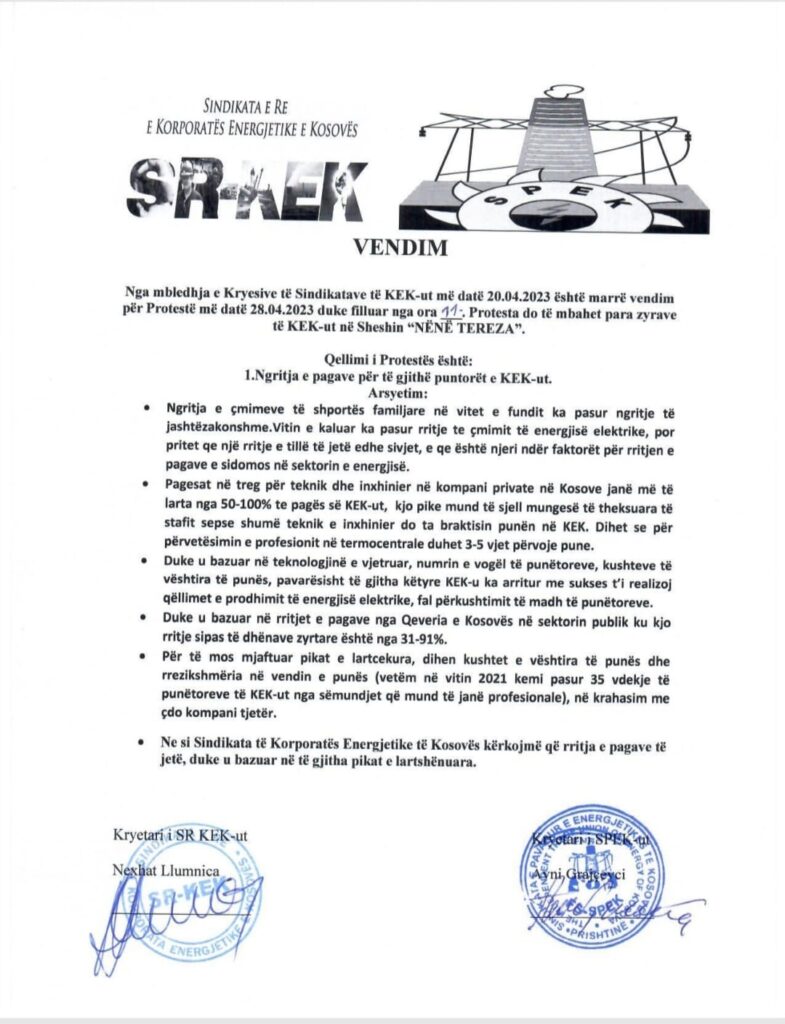 “Nga mbledhja e Kryesive të Sindikatave të KEK-ut më datë 20.04.2023 është marrë vendim për Protestë më datë 28.04.2023 duke filluar nga ora 11:00. Protesta do të mbahet para zyrave të KEK-ut në Sheshin “NËNË TEREZA”. Edhe pse ishte një premtim nga ana e Bordit për realizimin e kërkesës së Sindikatave të KEK-ut por edhe premtim publik permes komunikatës së datës 03.04.2023. Si më poshtë: Duke pasur tërë mirëkuptimin për kërkesat e punëtorëve, pas përfundimit të auditimit dhe certifikimit të pasqyrave financiare në fund të muajit Prill të këtij viti, Bordi dhe Menaxhmenti i KEK-ut, do të shqyrtojë kërkesën e sindikatave se sa do të ketë mundësi që të përfitojnë punonjësit e KEK-ut. Përkundër premtimit kjo nuk po ndodhë prandaj ne vazhdojmë. “Ngrite zërin për ta ngritur pagën””, është bërë e ditur në komunikatë.